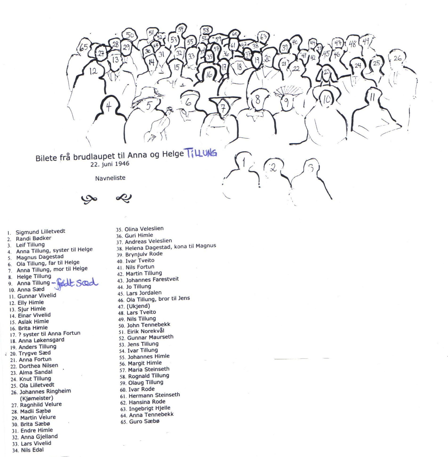 Biletet er teke 22. juni 1946, og viser deltakarane i bryllaupet til Helge Tillung og Anna Sæd.